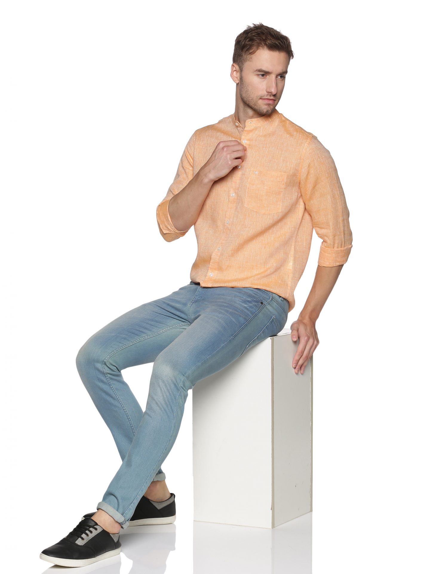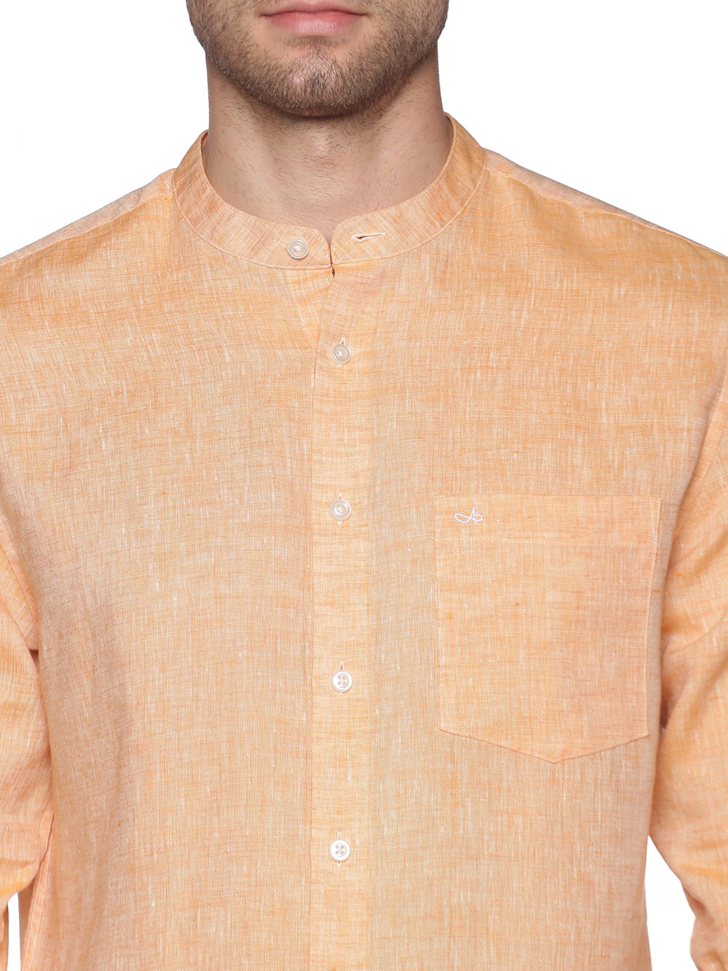 Cool & flowy linen mandrin collar shirt with patch pocket in eye-pleasing apricot shade.